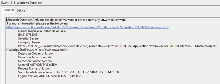 Interestingly, attempting to run the above command line may result in an outright block by Windows Defender Antivirus (not ASR).