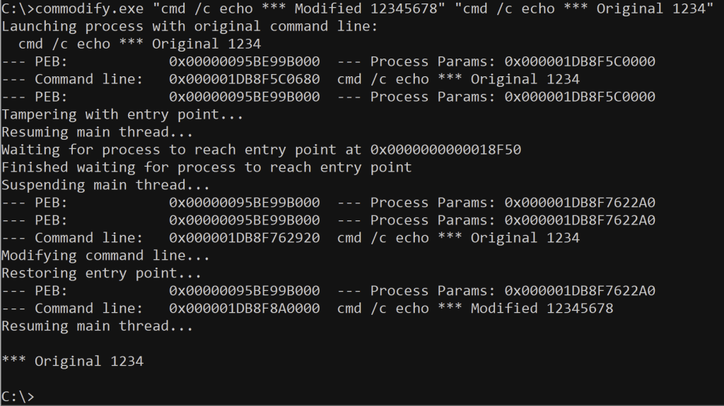 2. Modify the command line in the new process with something that could launch our desired executable: