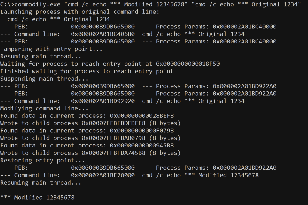 lRet = WriteProcessMemory(processInfo.hProcess, pCmdLine, newCmdLineBuf(0), UBound(newCmdLineBuf), r)